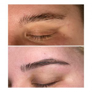 Before-and-after photo of Alexis’ brow waxing expertise.