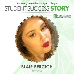 Being no stranger to Evergreen before enrolling in our Esthetics program, Blair has been apart of the Evergreen family in other avenues. “For over two years I have worked as the Front Desk Coordinator at our Bellevue location. In my position, I get to witness the incredible transformations that students create with our guests. The confidence that students can bring to their guests is something that I knew I wanted to be part of.” Blair not only sees the industry for what it has to offer many individuals out there, but also what she can offer to those that come in to get pampered by her. It isn’t just about the ‘work’ but more so, how Blair can treat the inner person occupying her treatment room. For Blair it’s about what she can accomplish for the soul of the ladies and gentlemen trusting in her.