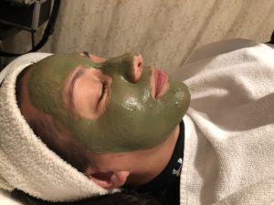 Ms. Emily Hummel, in the midst of a facial, adding in that necessary masking step for her client needs.