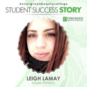 “To share a little bit about myself, I’ll share a few reasons why I decided to look into the beauty industry in the first place. I chose this field because I have done multiple things within the past that fit along with the Master Esthetics program. I have been trained and have worked in the medical field within different avenues; firefighting, emergency medical technician (EMT), and a certified nursing assistant (CNA). Before being enrolled at Evergreen Beauty College I was working in the medical field as a CNA and had been enrolled in nursing school before I decided to go a different route. A CNA can be a very hard job on your body and after some thought I had decided to look into a career that still helps people, but in a different type of way. Once I started looking into Esthetics, I came across Evergreen Beauty College. The touring process is what got me and was one of the reasons I enrolled! Everyone there at the campus was so kind and very interested in what I had to say, ” shared Leigh.