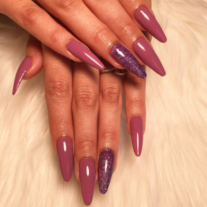 Great technique and well balanced artificial set finished with a glitter accent nail was executed flawlessly by Ms. Janet.