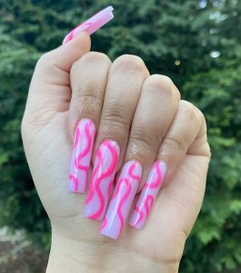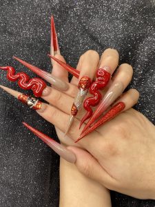 Ms. Kayla’s specialty – long creative acrylic nails, long and eye catching.