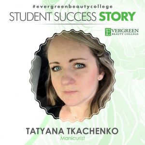 “I chose Evergreen Beauty College for a couple of different reasons, firstly, Evergreen was close to home and secondly, Evergreen is one of the few beauty schools that offers a reputable nail program. Most beauty colleges focus on cosmetology alone or pair it with esthetics (skin care),” says Tatyana. The nail industry is expanding and becoming more reputable thanks to Evergreen and some other school across the United States. Our philosophy is to unleash the creative minds that can preserve the integrity of the nails being worked on. Tatyana being one of those nail technicians looking at the whole aspect for the client.